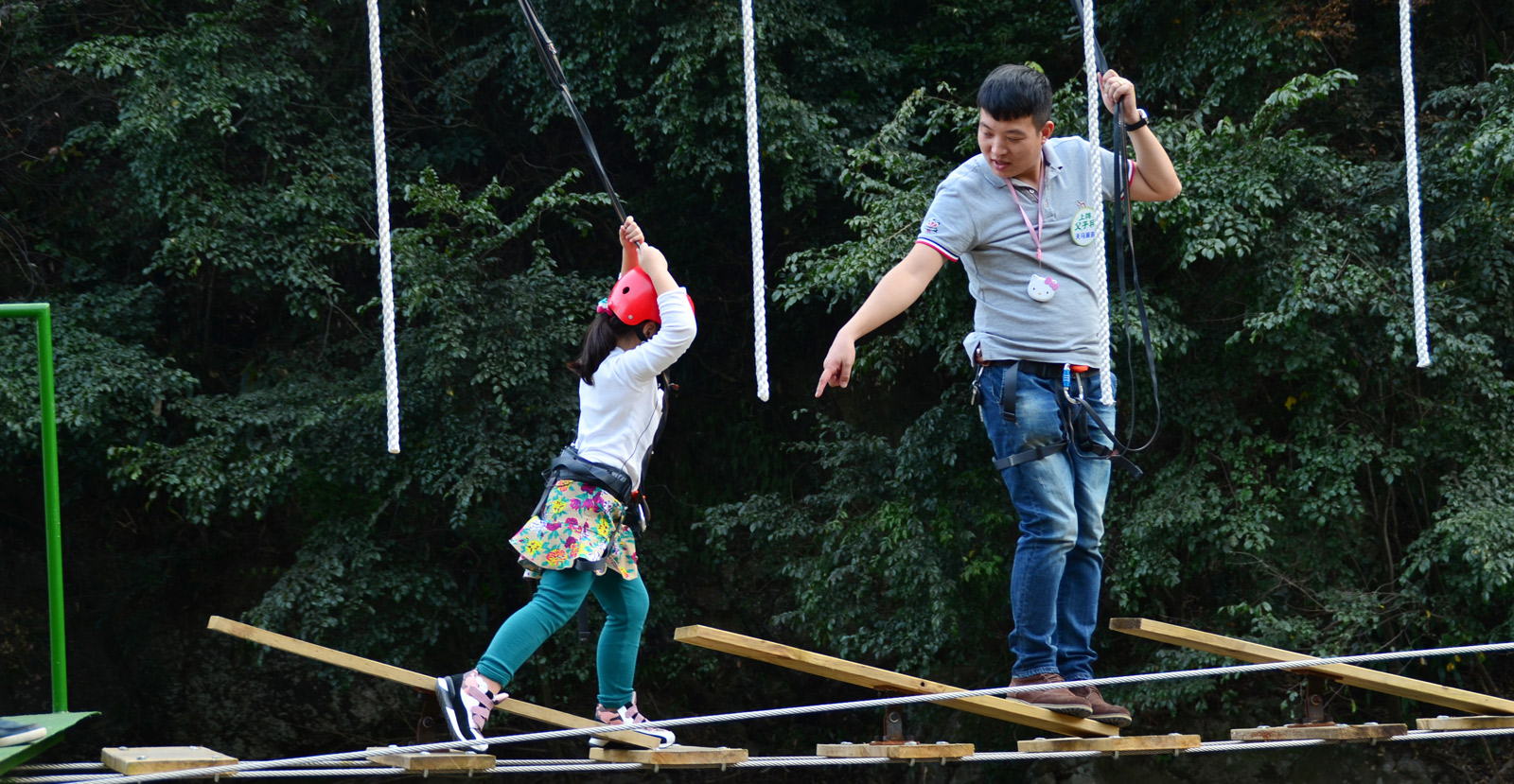 其中有浮橋、天使之手——蹺蹺板、網(wǎng)墻、梅花樁、玻璃橋、吊橋、緬甸橋、獨(dú)木橋、穿越行走、天梯、A字橋、滑道。