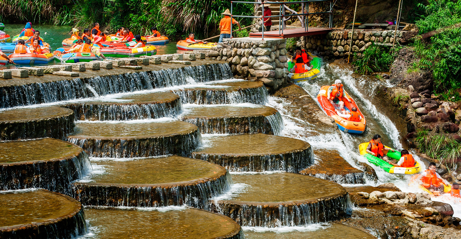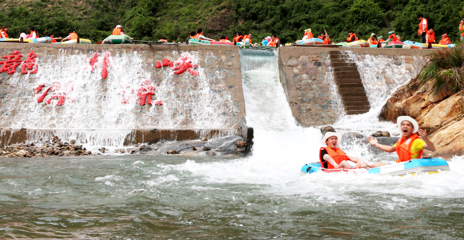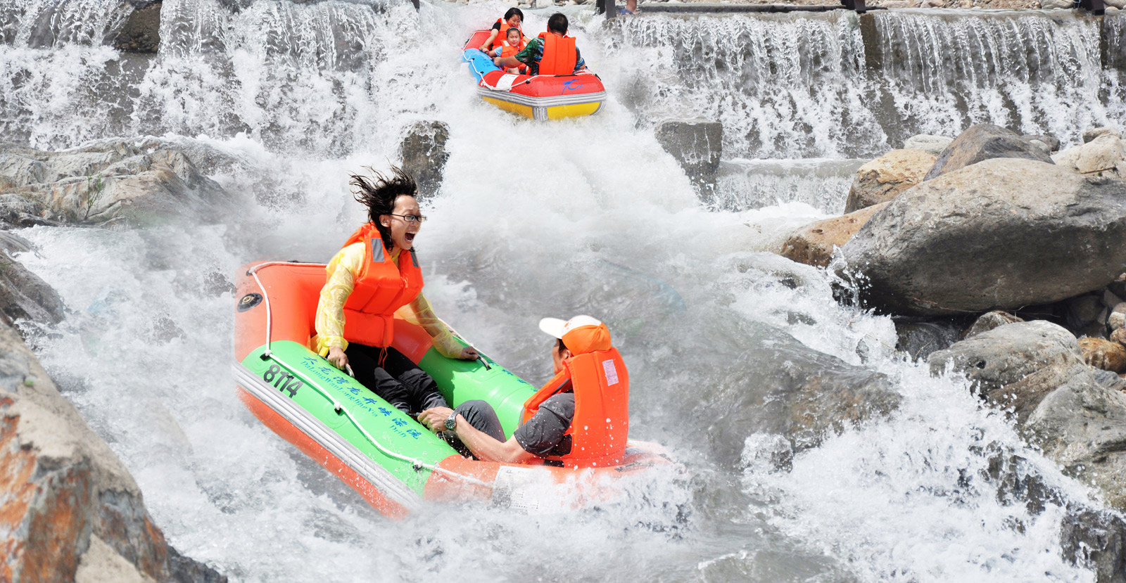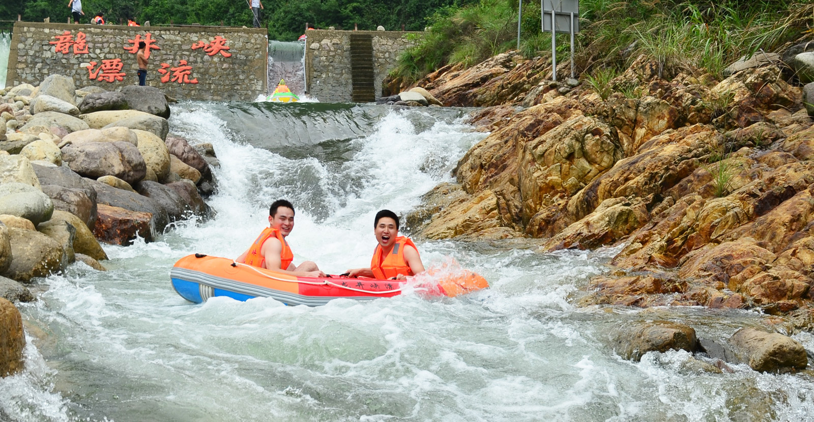 激情漂流全長3公里,首尾落差128米,俯沖水壩3-5米不等,漂流全程一個(gè)半小時(shí)左右。